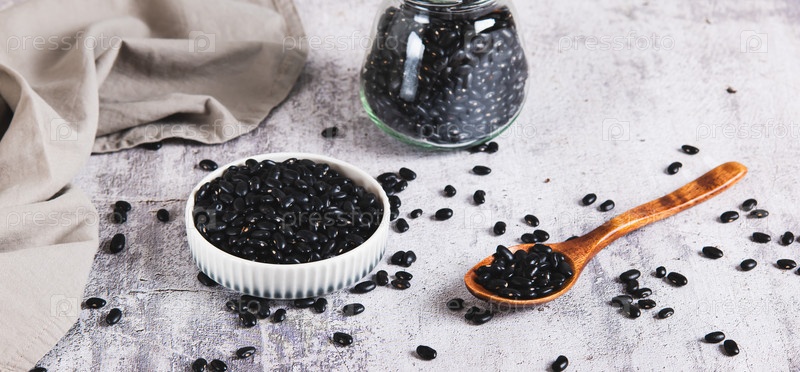 Сырые черные бобы в миске и в ложке на столе веб-баннер