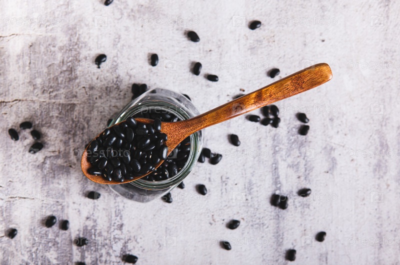 Сырые черные бобы в деревянной ложке на консервной банки вид сверху