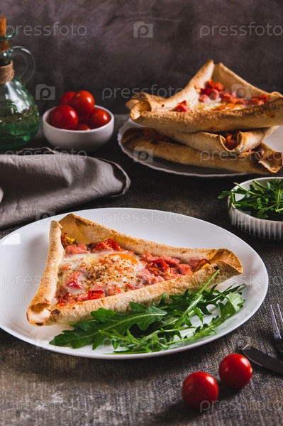 Яйцо, колбаса и помидоры выпечены в треугольной тортилье на тарелке на вертикальном столе