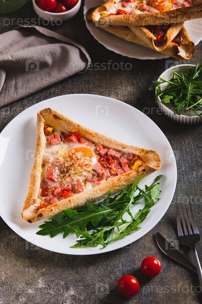 Свернутые яйца с беконом и вишневыми помидорами в тортильях и ругуле на тарелке вертикальный вид
