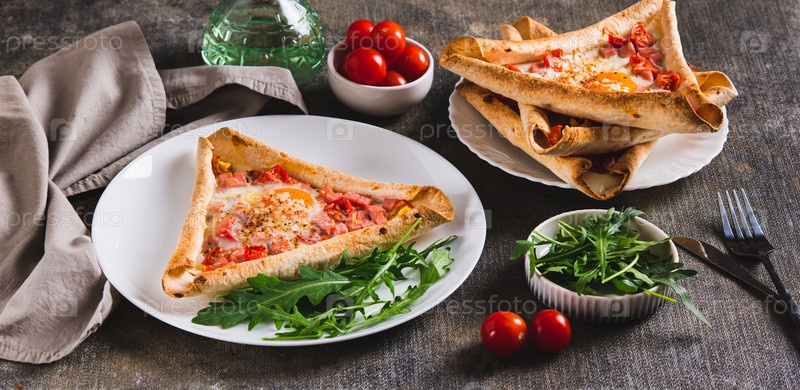 Яйцо, колбаса и помидоры выпечены в треугольной тортилье на тарелке на веб-баннерном столе