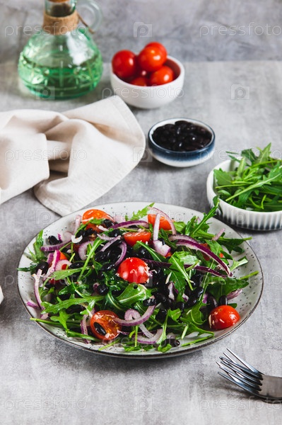 Свежий салат с черными бобами, помидорами вишневыми, ругулой и красным луком на тарелке вертикальный вид