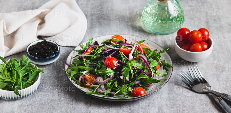 Свежий салат с черными бобами, помидорами вишневыми, ругулой и красным луком на веб-баннере
