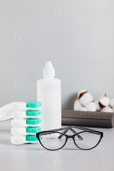 Концепция выбора между очками и контактными линзами на столе с вертикальным видом