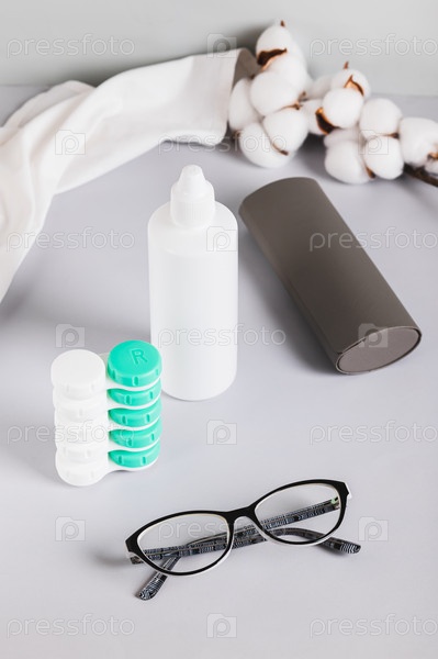 Очки, контейнеры для линз, чехол для очков и бутылка на столе с вертикальным видом