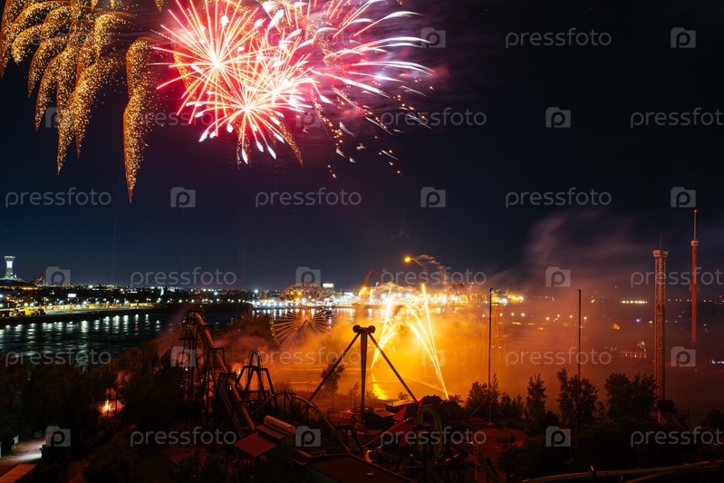 Фестиваль фейерверков над водой с отражением на черном фоне неба