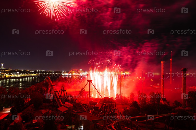 Фестиваль фейерверков над водой с отражением на черном фоне неба