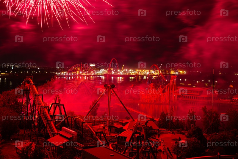 Фестиваль фейерверков над водой с отражением на черном фоне неба