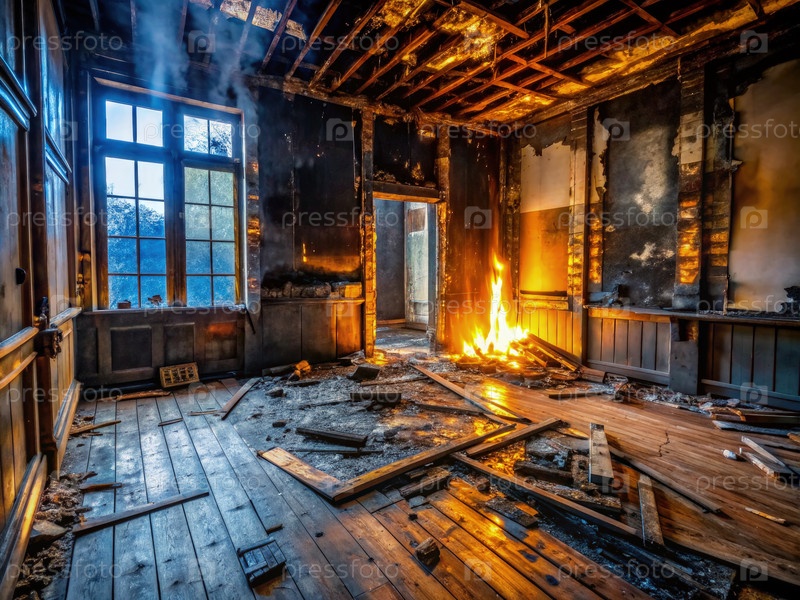 Огонь повреждает деревянный пол в комнате, генерируя AI