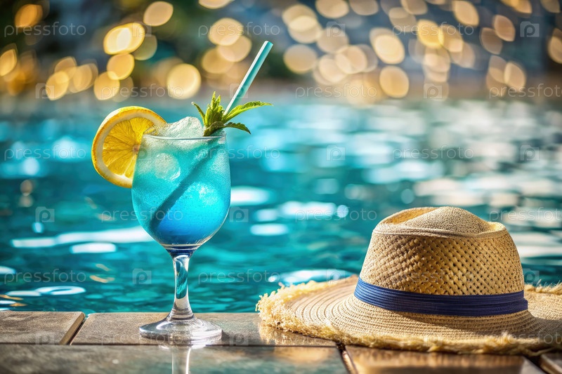 Коктейль 'Голубая лагуна' у бассейна с соломенной шляпой