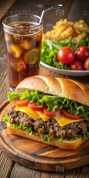Классический гамбургер со салатом, томатами и сыром на режущей доске