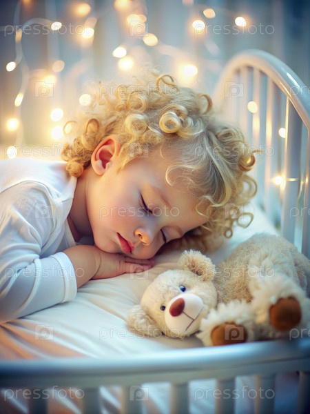 Ребенок спит в колыбели с медведем Тедди