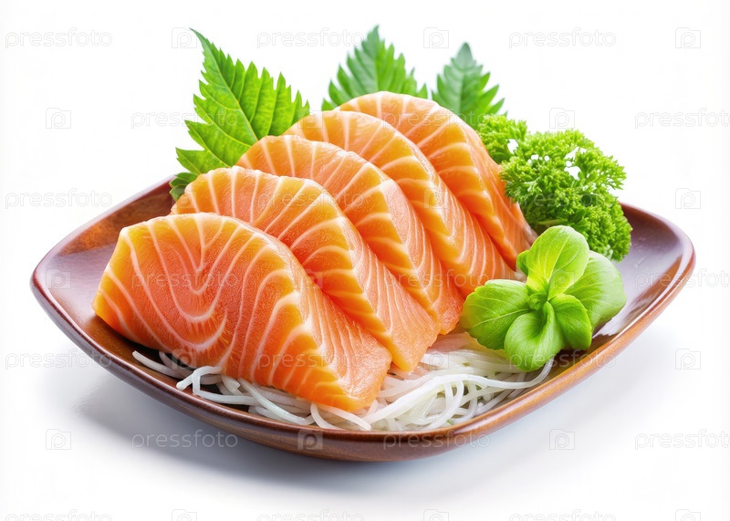 Свежий сырой сашими лосось на тарелке зеленого