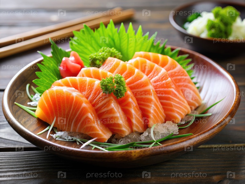 Свежий лосось сашими подается на деревянной плите с зеленым блюдом