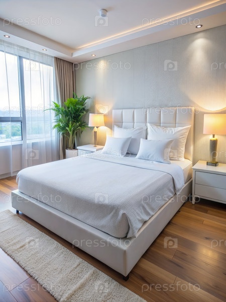 Современная белая спальня с большим окном и деревянным полом