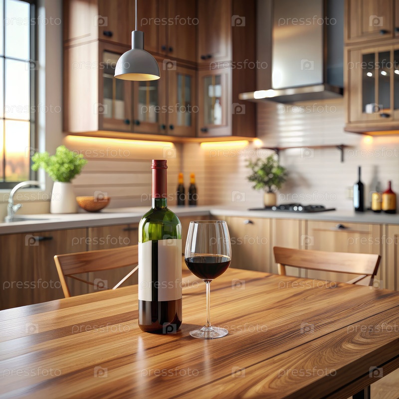 Вино и стекло на деревянном кухонном столе с современным дизайном фермерского дома