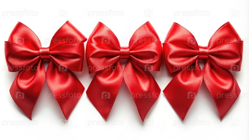 Три ярко-красных атласных лука расположены в ряд на белом фоне