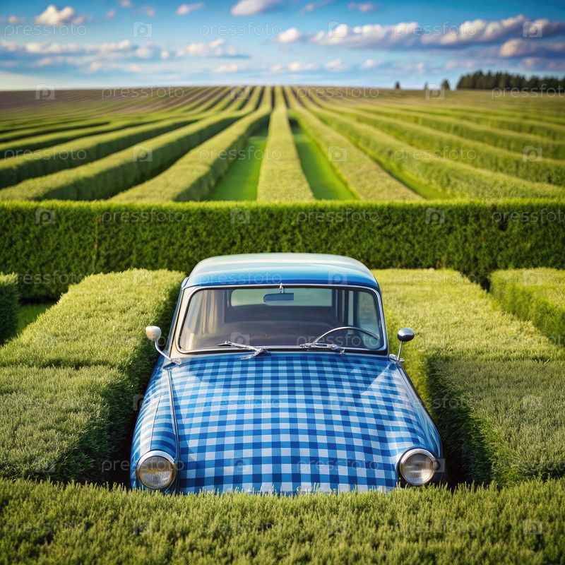 Голубая машина частично скрыта в зеленом лабиринтном поле
