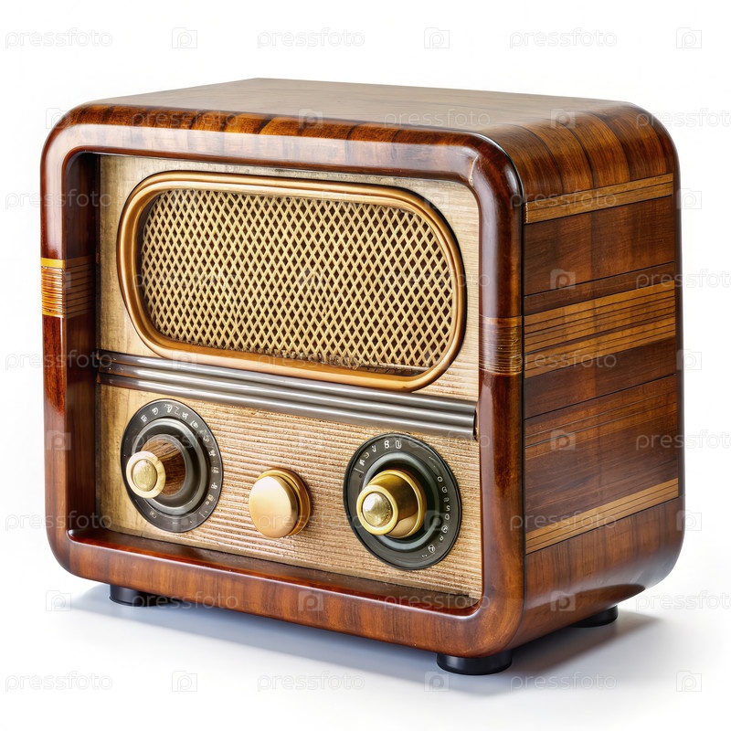 Античное деревянное радио с золотыми ручками на белом фоне
