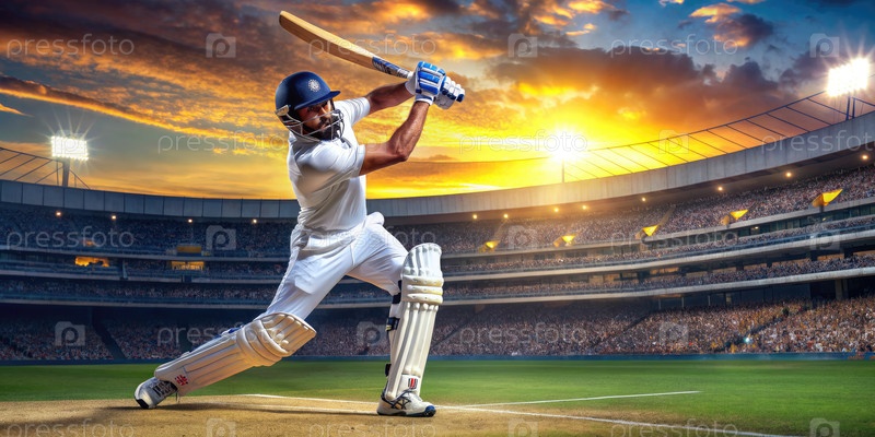 Игрок крикета в золотой час на переполненном стадионе