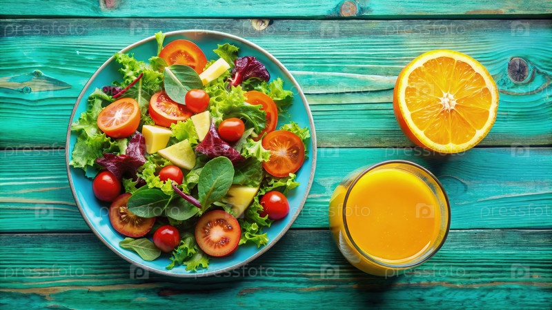 Свежий салат с апельсиновым соком на деревянном столе