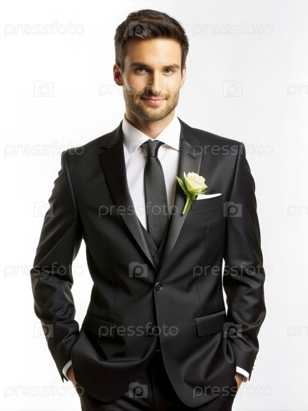 Красивый жених в черном костюме с белым бутониером