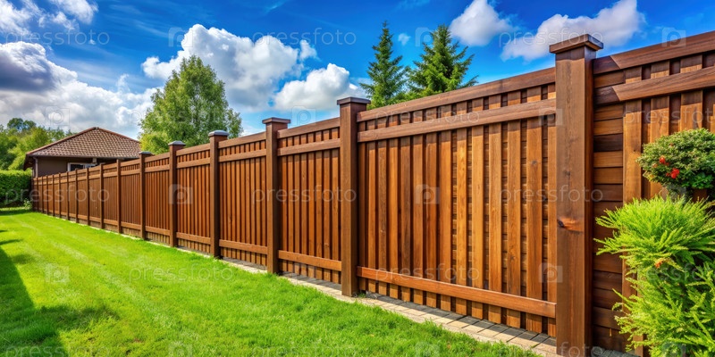 Красивый коричневый деревянный забор на зеленом заднем дворе в солнечный день