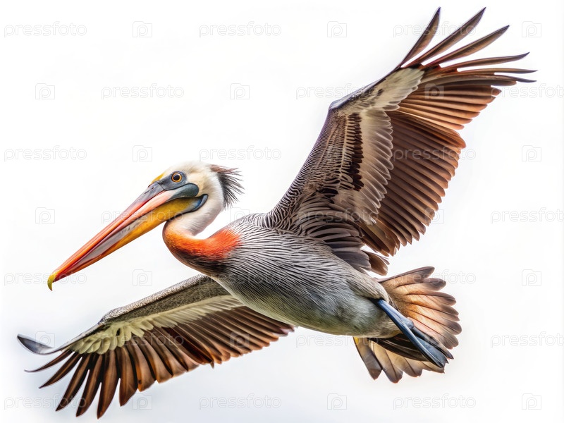 Коричневый пеликан в полете на белом фоне Generating AI