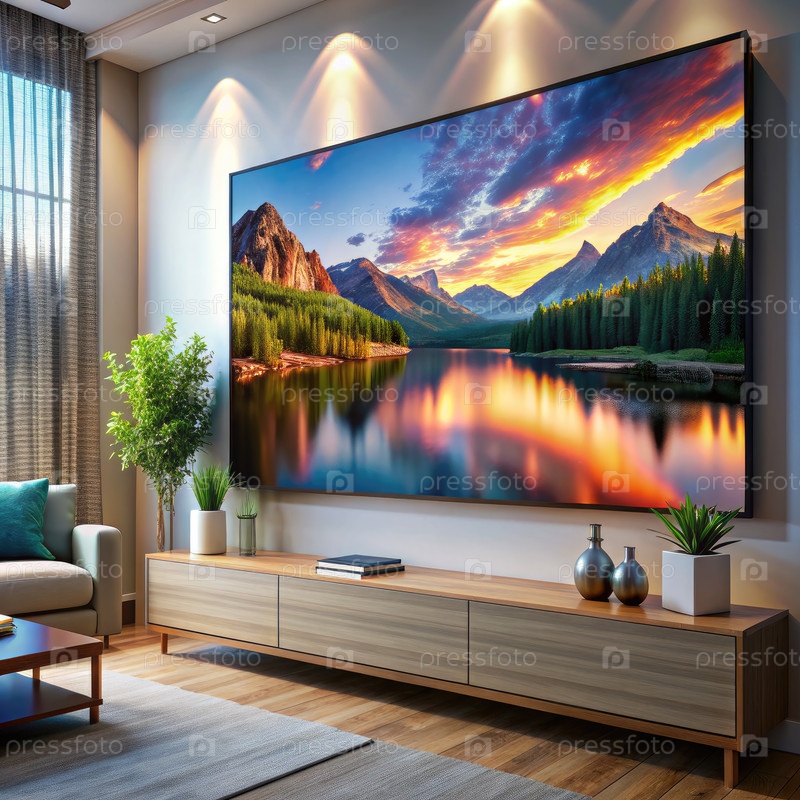 Современная гостиная с большим экраном, показывающим закат горного озера
