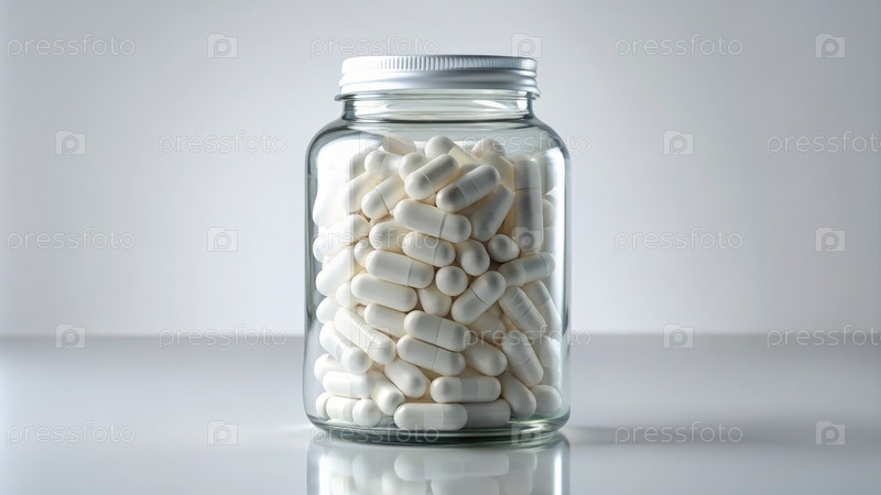 Прозрачная бутылка, заполненная белыми таблетками на белой поверхности