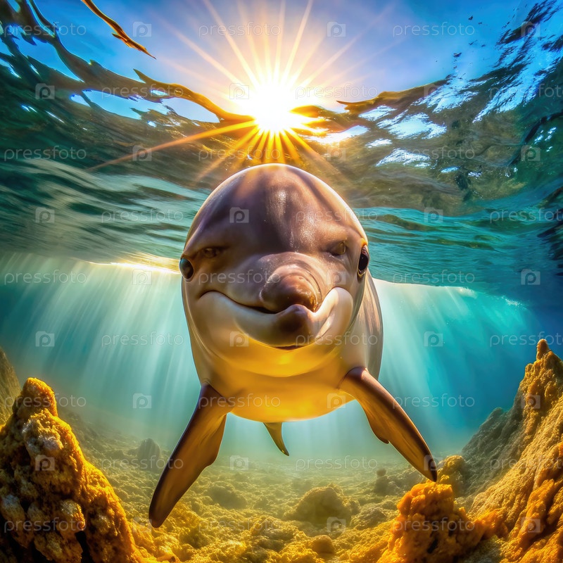Подводный портрет дельфина, плавающего к Солнцу