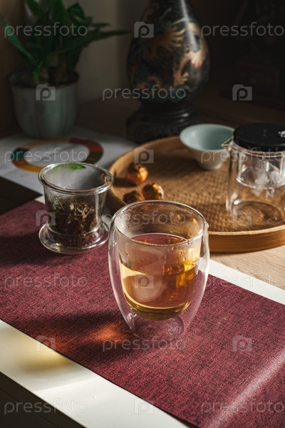 Спокойный и эстетически привлекательный чайный набор со стаканчиком из стекла вместе с природными элементами