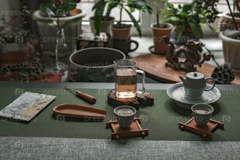 Красивая чайная церемония, дополненная уютными комнатными растениями для теплой атмосферы