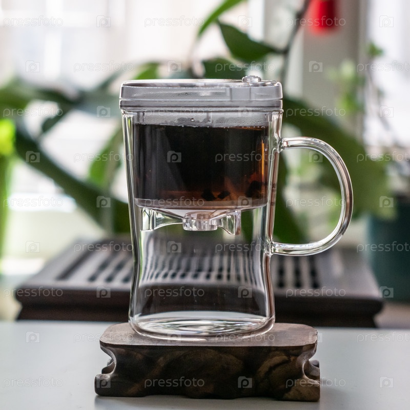 Изысканный и элегантный стеклянный кофеварка, которая красиво освещена естественным светом