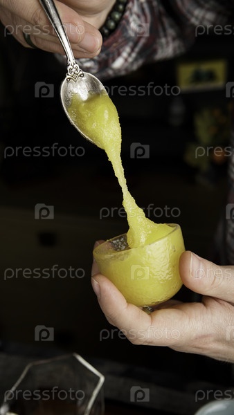 Ложка зеленой текстуры, аккуратно подаваемая из красивого декоративного контейнера