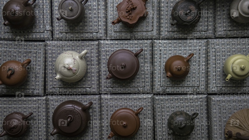 Вид сверху различных чайников на текстурированных ковриках, показывающих их уникальный дизайн и яркие цвета