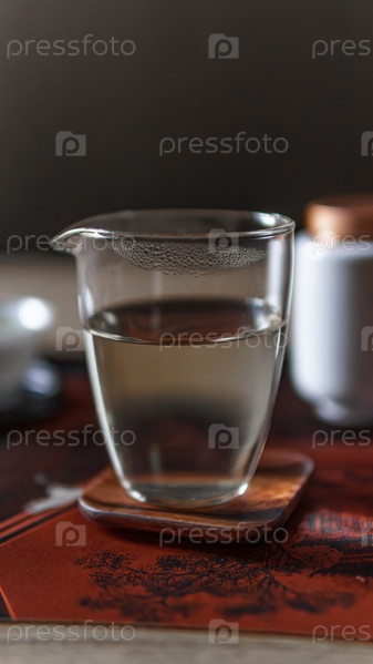 Элегантная чашка, заполненная прозрачной жидкостью на красивой красочной поверхности стола