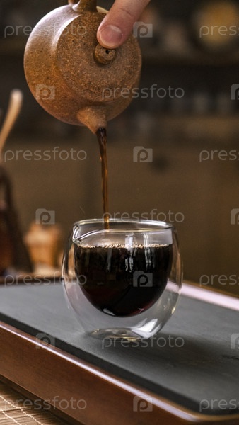 Спокойный момент, захватывающий свежевыжатый кофе, заливаемый в стеклянную чашку, демонстрирующую искусство заваривания