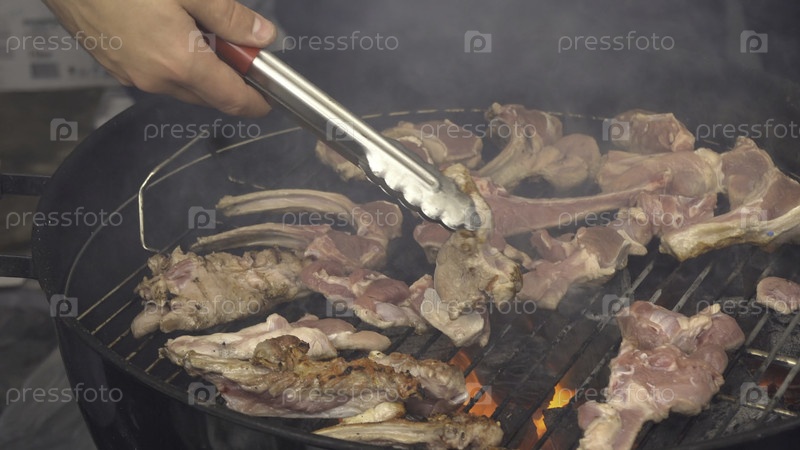 Приготовление стейка для барбекю на горячем гриле во время кемпинга, в высокой четкости