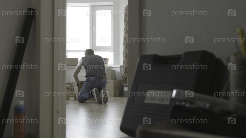 Человек ищет что-то в коробке, общий взгляд