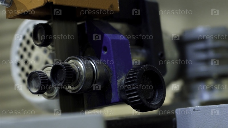 Режущая лента пила на деревообрабатывающем заводе. Продолжайте. Близкий план профессиональной группы видел машину в движении перед вырубкой древесины в деревообрабатывающей промышленности