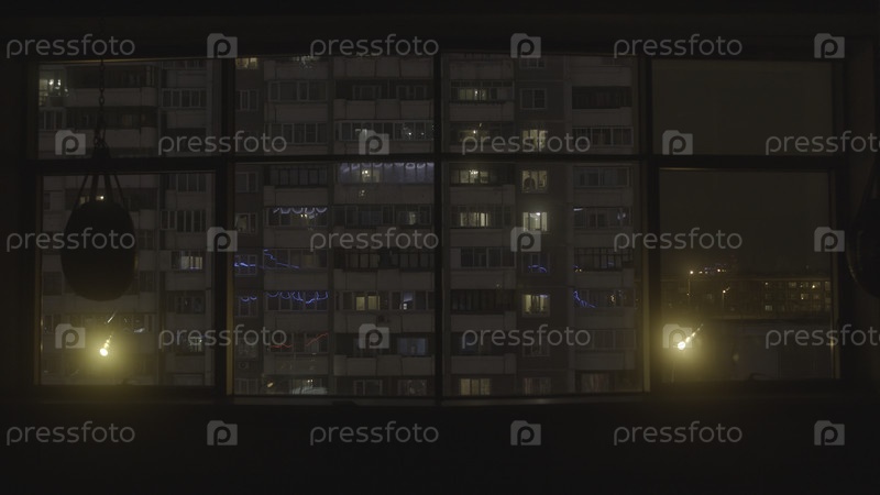 Вид из окна старого дома с окнами ночью. резервные кадры. вид из спортзала с панорамными окнами перед жилым зданием со светящимися квартирами в ночном городе