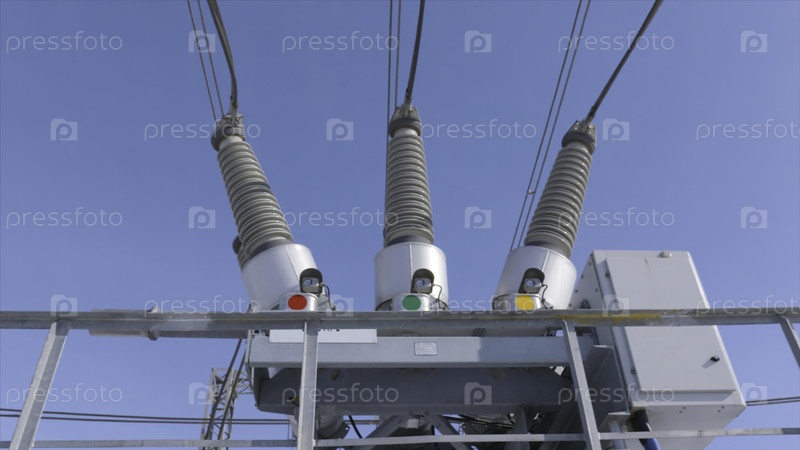 Электрический трансформатор на подстанции. Продолжайте. Переключатель газового баллона на электротрансформационной подстанции. Высокопроводное оборудование против голубого неба