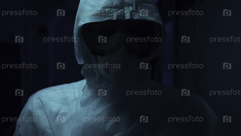 Подробности квеста ужасов. Резервные кадры. Закройте неизвестного человека в защитном костюме и маске, пугающе стоящего в коридоре с мигающим светом