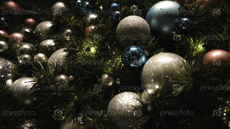 Близкий план красивых многоцветных рождественских шаров, висящих на шерстяной елке и рождественские огни