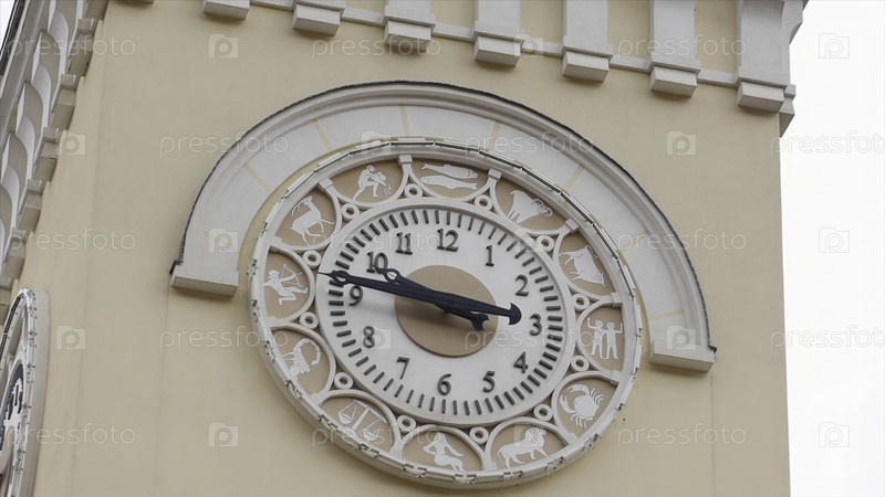 Старая башня часов. Часовая башня с старым простым стилем набора циферблата окружена знаками зодиака. Архитектура старой часовой башни