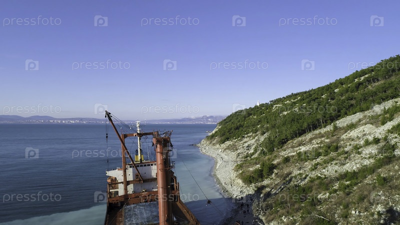 Верхний вид повреждения циклона поврежденного судна, смытого на берег от циклона.Стреляйте.Судно вымыто на берег