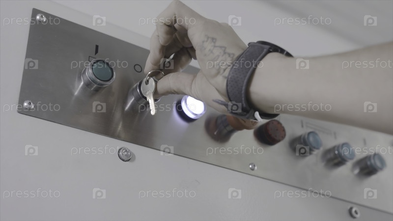 Эгинейер поворачивает ключ на панели управления. Продолжайте. Закрытие руки работника превращает ключ питания в работу промышленного оборудования. Панель управления с ключом на промышленной машине