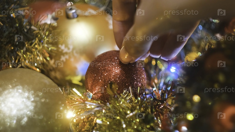 Завершение красивых игрушек на рождественской елке с гирляндой. Концепция. Яркие блестящие игрушки с бриллиантной гирландой лежат перед украшением Рождественской елки. Уютная композиция с рождественскими игрушками