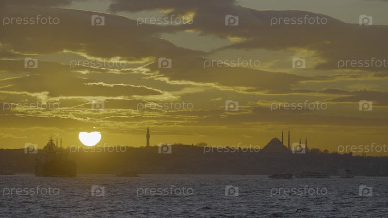 Красивый силуэт города у моря на фоне заката. Идите вперед. Морской пейзаж с городом на побережье против яркого захода солнца. Морский торговый город во время красивого заката